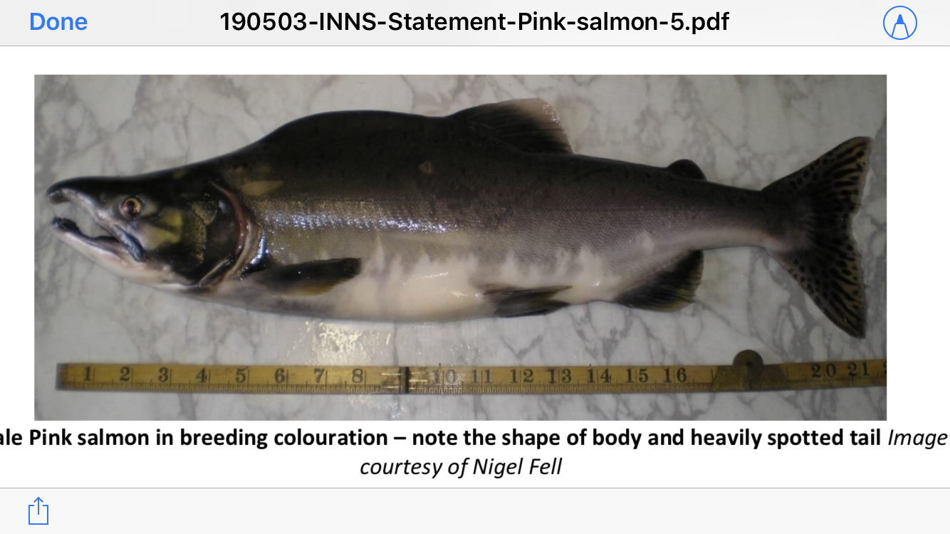 Background In 2017, unprecedented numbers of Pink salmon were captured across the UK. Captures were also reported in Norway, Finland, Iceland, Denmark and Germany. Pink salmon (Oncorhynchus gorbuscha) are not native to Scotland and are likely to have ‘strayed’ from some of the rivers in northern Norway or Russia. These fish were originally introduced to some Russian rivers in the 1960s, have slowly spread westwards and have now colonised some northern Norwegian rivers. These fish spawn at a different time from Atlantic salmon, have a two-year lifecycle and generally spawn in summer (and often in main river channels in the lower reaches of rivers, and sometimes in upstream tributaries).